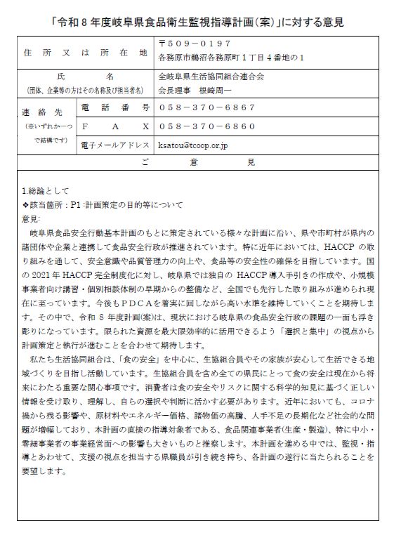 岐阜県生協連では、今年も計画案への意見をまとめ、1月28日、岐阜県に提出しました。
