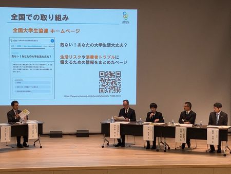 大学生活を支える購買・食堂・住まい紹介など、生協が担う役割を説明するとともに、若者が直面しやすい契約トラブルや悪質商法への注意喚起の取り組みを紹介。