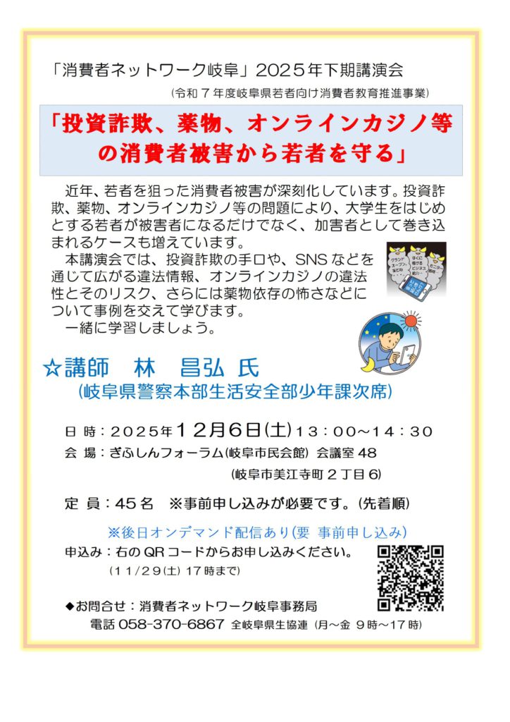 消費者ネットワーク岐阜が主催する講演会のお知らせです。