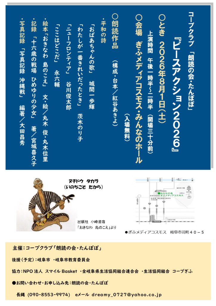 今年も「朗読の会・たんぽぽ」主催のピースアクションが開催されます。全岐阜県生活協同組合連合会は今年も同会の活動を応援します。ぜひご来場ください。